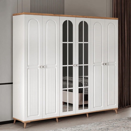 Bohem 6 Kapaklı Aynalı Komple MDF Gardırop, odanıza çağdaş bir esinti ve zarif bir estetik katmak için özel olarak tasarlanmıştır. Kapaklardaki ayrı ayrı bölmelere sahip aynalar, şıklığı ve işlevselliği bir arada sunarak, odanızı daha aydınlık ve geniş gösterirken aynı zamanda günlük hazırlıklarınız için pratik bir kullanım sağlar. Bu aynalar, gardırobunuzun sade beyaz yüzeyleri arasında sofistike bir kontrast oluşturur ve Atlantik Çam rengi üst ve alt tabla ile doğal bir sıcaklık yayar. Atlantik Çam’ın sıcak tonlarının yanı sıra zamansız beyazın zarafetiyle her yatak odasına uyum sağlar.