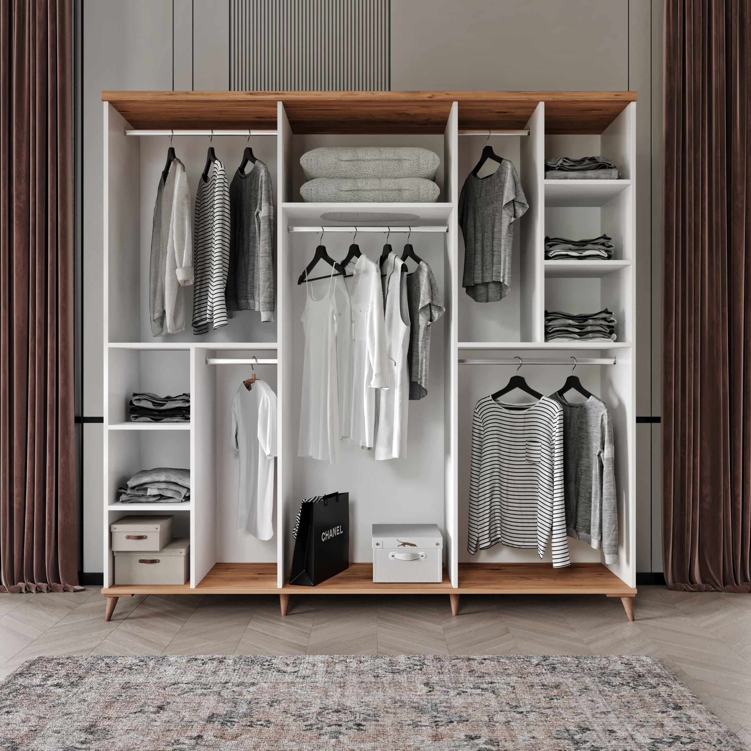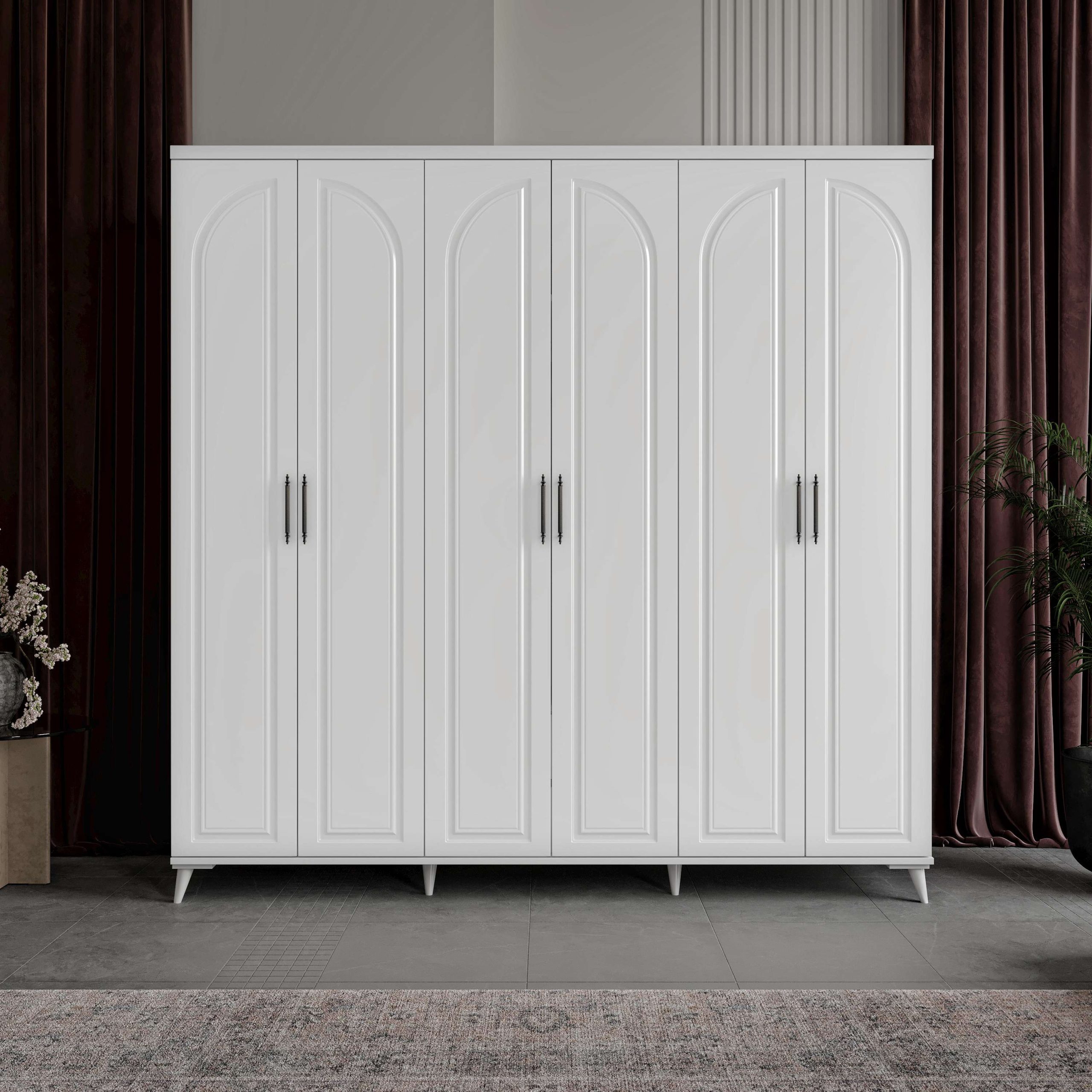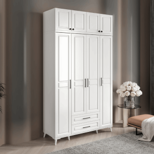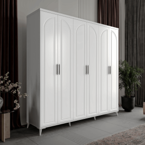 Gardırobun kapak kolları, minimalist tasarımıyla dikkat çeker ve her açılışta sorunsuz bir deneyim sunar. Frenli menteşe sistemi, kapakların sessizce ve güvenle kapanmasını sağlayarak evinizdeki huzuru korur. 5 askılık bölmesi ve 7 raflı bölme ile mükemmel düzenleme seçenekleri sunan bu gardırop, tüm giysilerinizi ve aksesuarlarınızı kolayca organize etmenize olanak tanır.