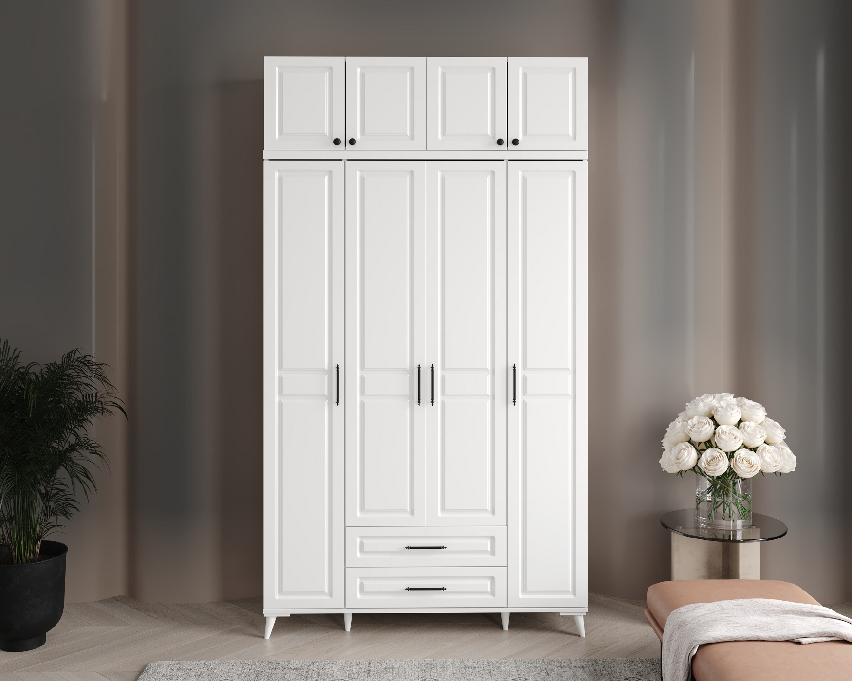 12 cm’lik ayak yüksekliği, hem estetik bir zarafet katarken hem de altının temizliğini kolaylaştırarak evinizin hijyenini üst düzeyde tutmanıza yardımcı olurken ve robot süpürgenizin rahatça hareket etmesine olanak tanır. Genişliği 210 cm, derinliği 52 cm ve yüksekliği 210 cm olan bu gardırop, geniş iç hacmiyle yaşam alanınızda etkileyici bir duruş sergiler.