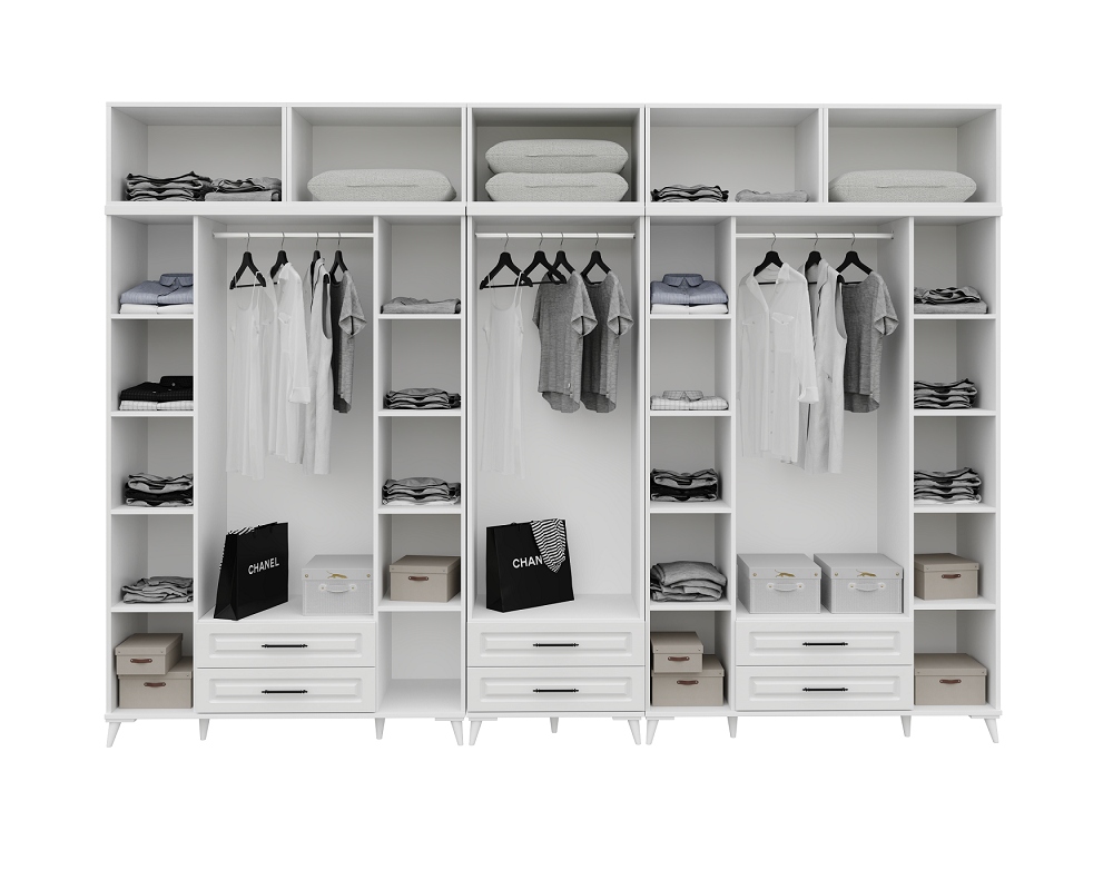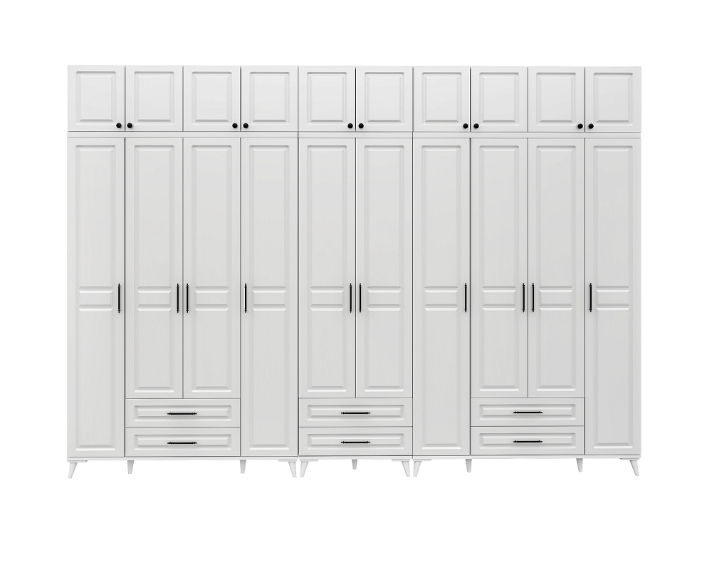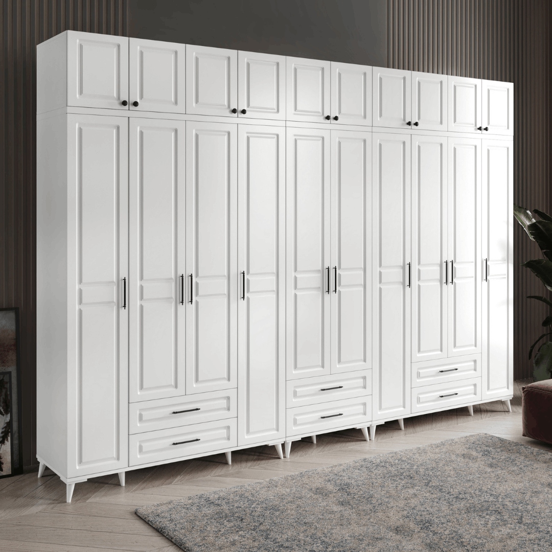 Yeni tasarlanmış Gözde gardırobunuz, tamamen beyaz rengi ve zarif tasarımıyla evinizde modern bir dokunuş oluşturuyor. Bu 10 kapaklı, 6 çekmeceli dev gardırop, 20 katlama raf alanı ve 3 askı bölümü ile gardırop düzenleme deneyiminizi tamamen değiştiriyor. Ayrıca, 5 bölümlük yüklük depolama alanı ile en üst kısımda ekstra alan sağlıyor.